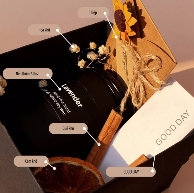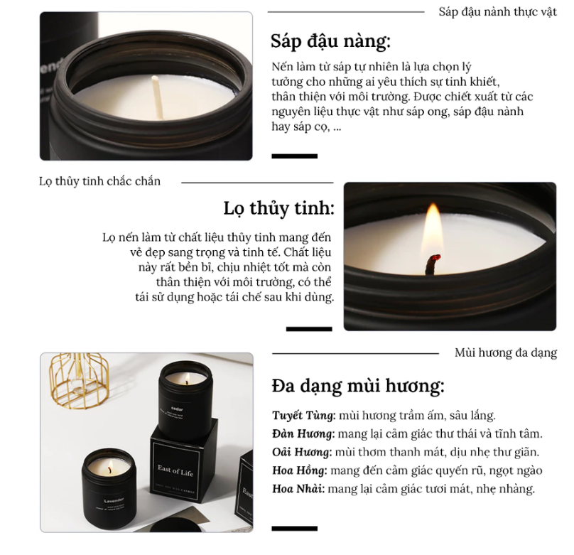 – Thành phần chính: Sáp đậu nành, tinh dầu thiên nhiên và hương liệu 100% thiên nhiên an toàn